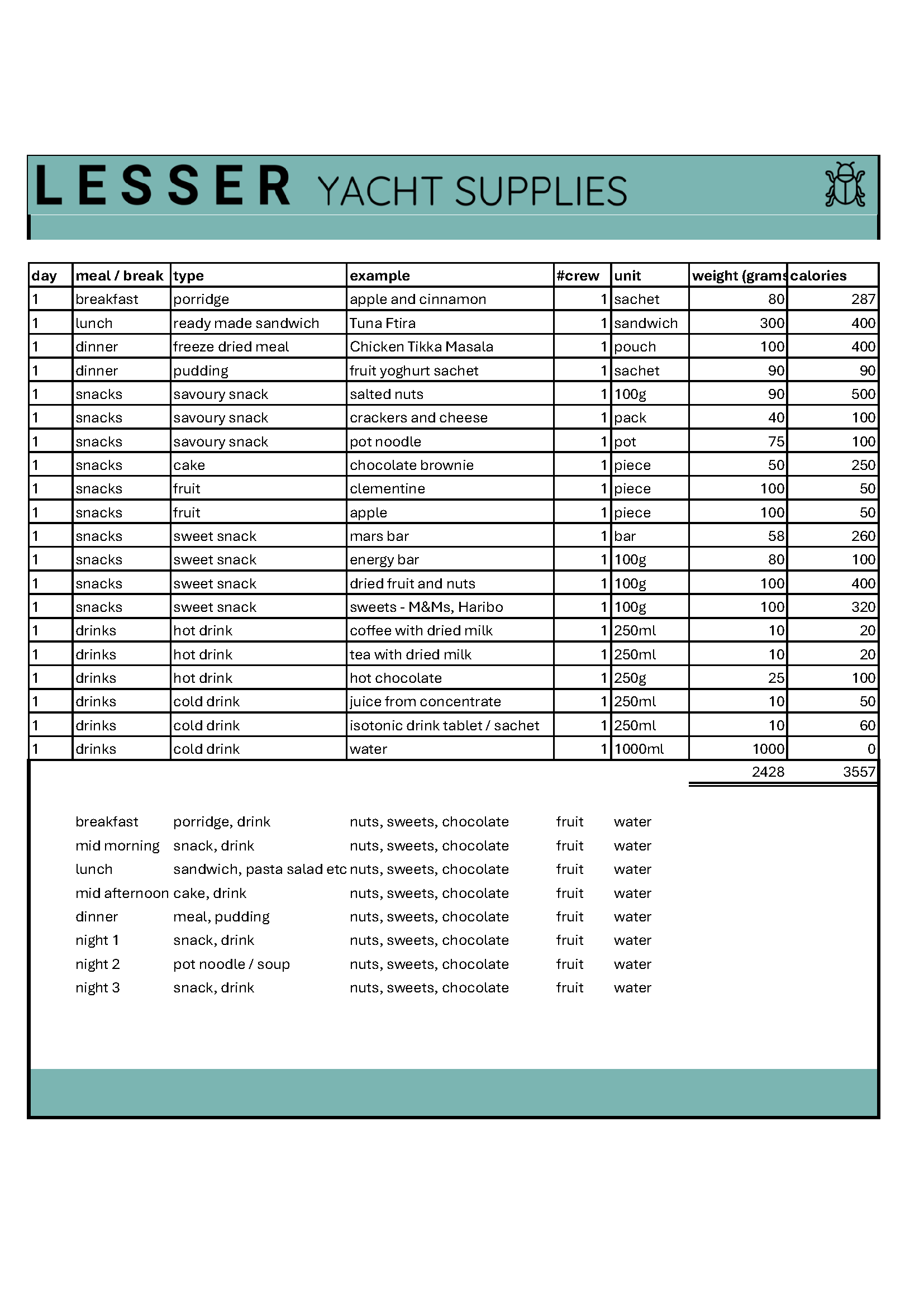 Sample menu plan for one day